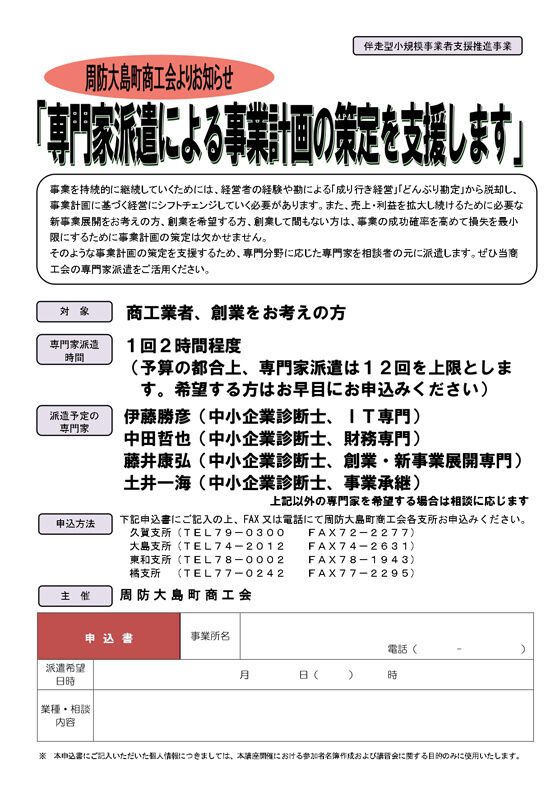 当商工会では、専門家派遣による事業計画の策定支援事業を
